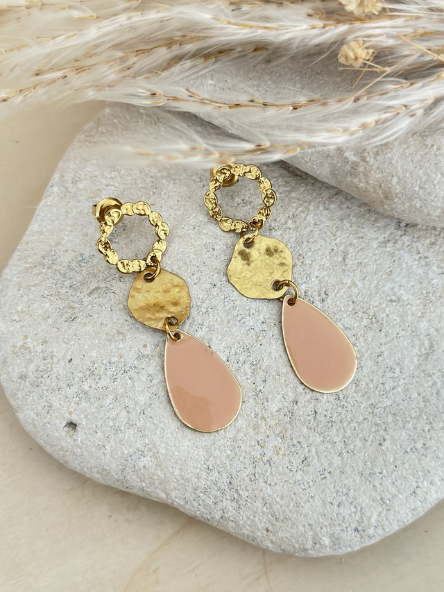 Composées d’un anneau texturé en laiton doré, d’une pastille martelée à la main et d’une délicate goutte en résine rose poudré, elles apportent une touche douce et lumineuse à votre tenue.