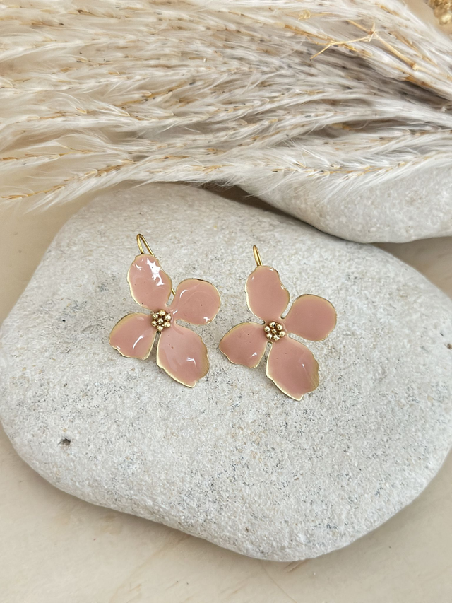 Délicates et lumineuses, ces boucles d’oreilles en forme de fleurs sont façonnées en laiton doré à l’or fin, puis sublimées par une résine colorée appliquée à la main.