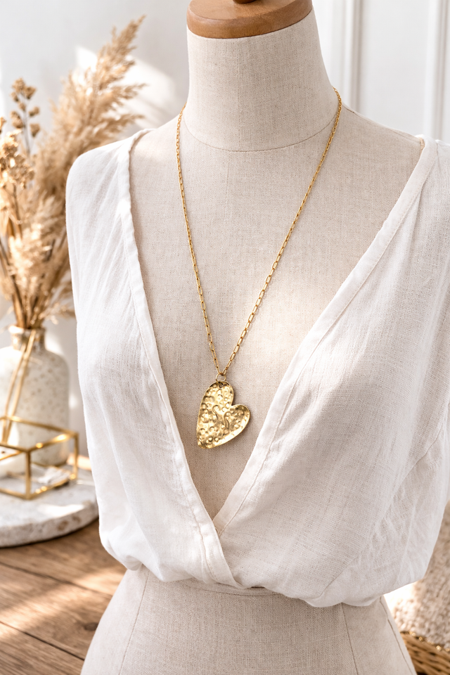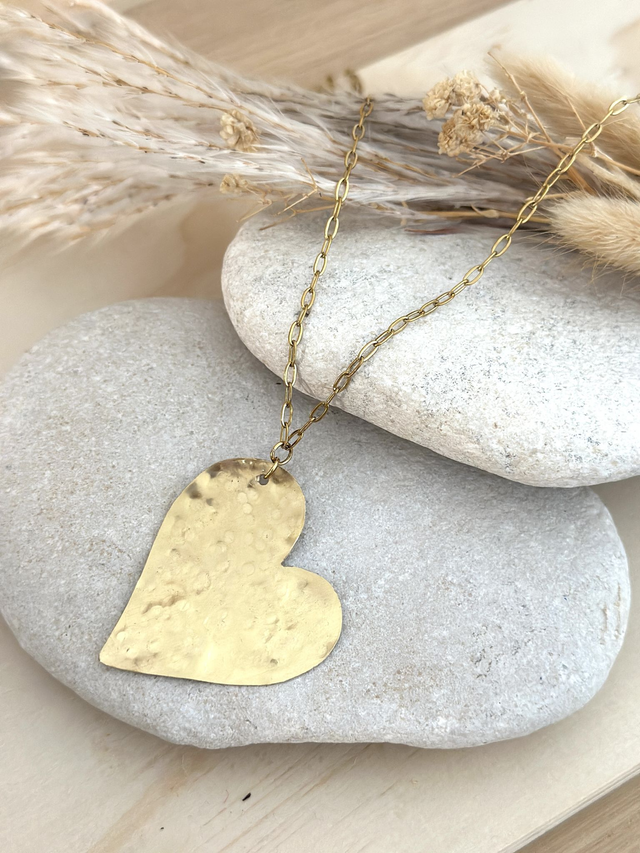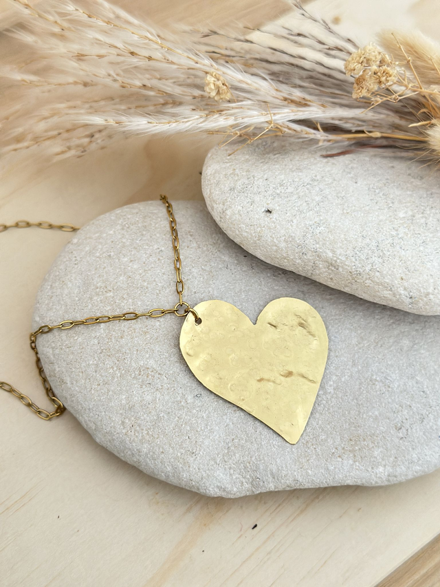 Son grand pendentif cœur en laiton est découpé puis martelé à la main, offrant un relief unique et une texture vibrante qui capte magnifiquement la lumière.