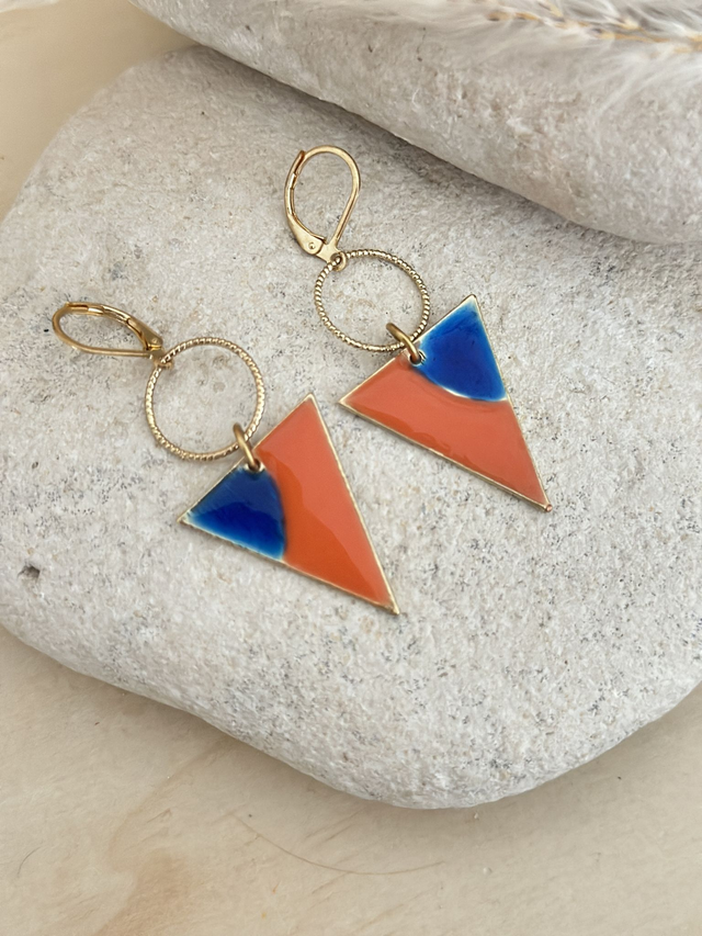 Graphiques et lumineuses, les boucles d’oreilles Johanna associent un triangle en laiton doré à une résine colorée appliquée à la main dans des nuances vibrantes d’orange et de bleu profond.