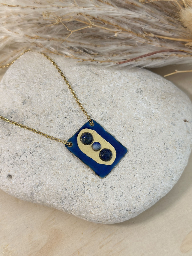 Collier pendentif rectangulaire en laiton martelé, rehaussé d’une résine bleue peinte à la main.