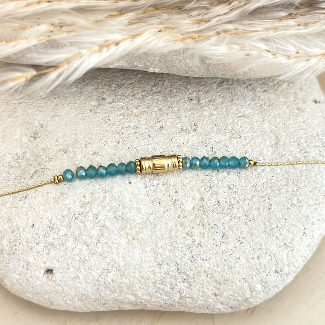 Joli bracelet en chaine serpentine très fine, ornée de perles en verre à facettes et joli cylindre en acier inoxydable .