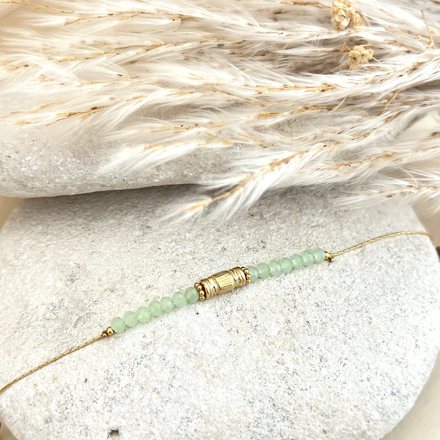 Joli bracelet en chaîne serpentine tres fine ornée de perles en verre à facettes et un joli cylindre en acier inoxydable.