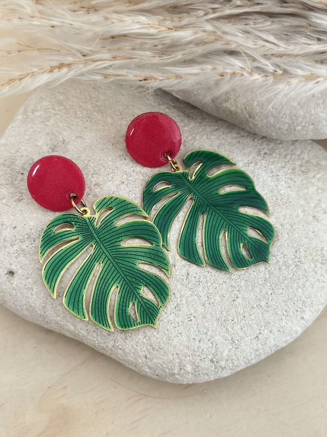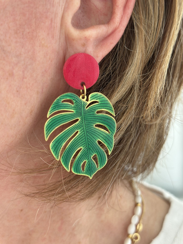 Les Boucles d'oreilles sont composées d’une pastille en tissu et d’une grande feuille tropicale en acier inoxydable colorée, ces boucles d’oreilles légères attirent le regard tout en restant élégantes. Leur design original mêle esprit bohème chic et modernité graphique.