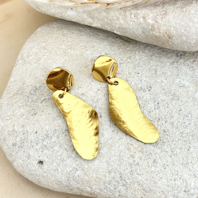 Ces boucles d’oreilles sont réalisées à la main en laiton découpé puis martelé, offrant une texture lumineuse et organique. Leur forme libre et légèrement ondulée capte la lumière à chaque mouvement, révélant tout le charme du travail artisanal.