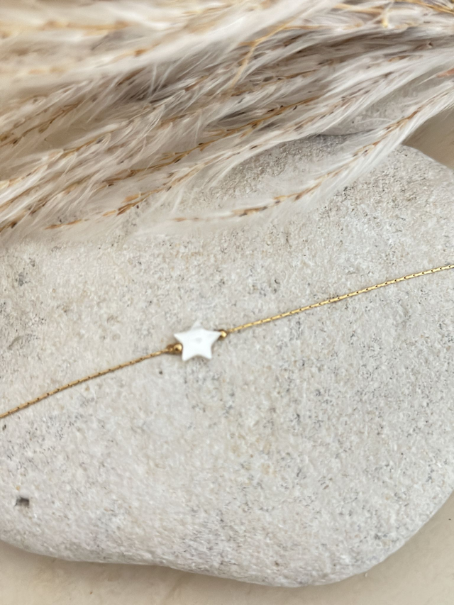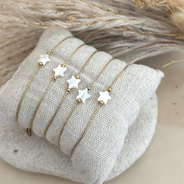 L’étoile en nacre capte subtilement la lumière et révèle de légers reflets irisés, rendant chaque pièce unique. Monté sur une chaîne fine et élégante, ce bracelet apporte une touche poétique et raffinée au poignet.