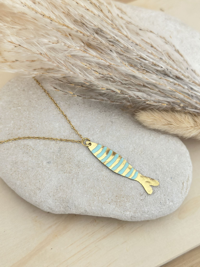 Son pendentif en laiton est découpé et martelé à la main, puis délicatement décoré de rayures turquoise en résine appliquée artisanalement. Chaque détail est travaillé avec soin, rendant chaque bijou unique.