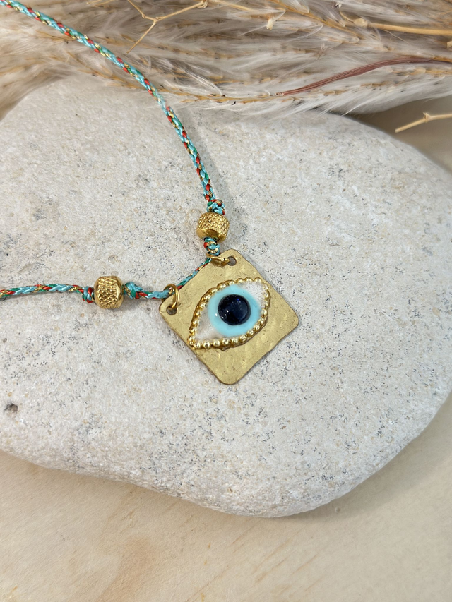 Collier pendentif carré en laiton martelé, orné d’un œil protecteur délicatement façonné à la main en résine colorée.